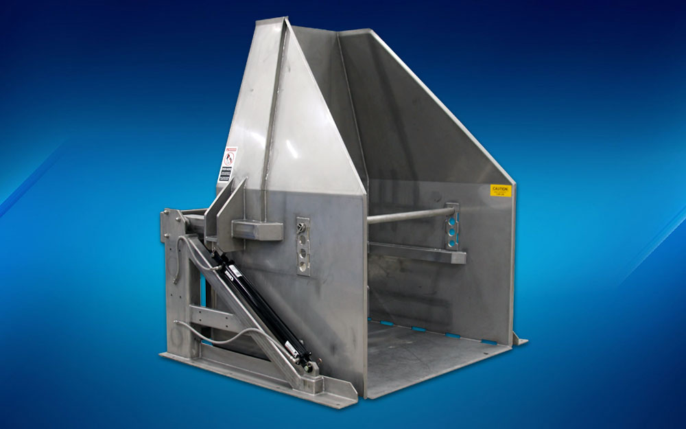 Triton Innovation has a very versatile box dumper product line for a magnitude of applications in the food and pharmaceutical industries. An efficient, reliable, ergonomic and sanitary method for dumping many types of containers. Available in a broad range of load capacities from under 500 lbs to over 10,000 lbs, including numerous dumping heights to choose from. Optional safety enclosures help keep personnel at a safe distance while the dumper is in motion. Front or side loading capabilities allow us to handle various container types. Fixed position or automated hold downs keep containers in place while being dumped. Sensors can be used for automated controlled flow dumping if an all-at-once or manually controlled dump is not desirable. Floor level is standard, however loading dock level dumping is also available, making loading waste compactors much easier. Using a Triton Innovation dumper in your facility can provide a more ergonomic environment and increase productivity.